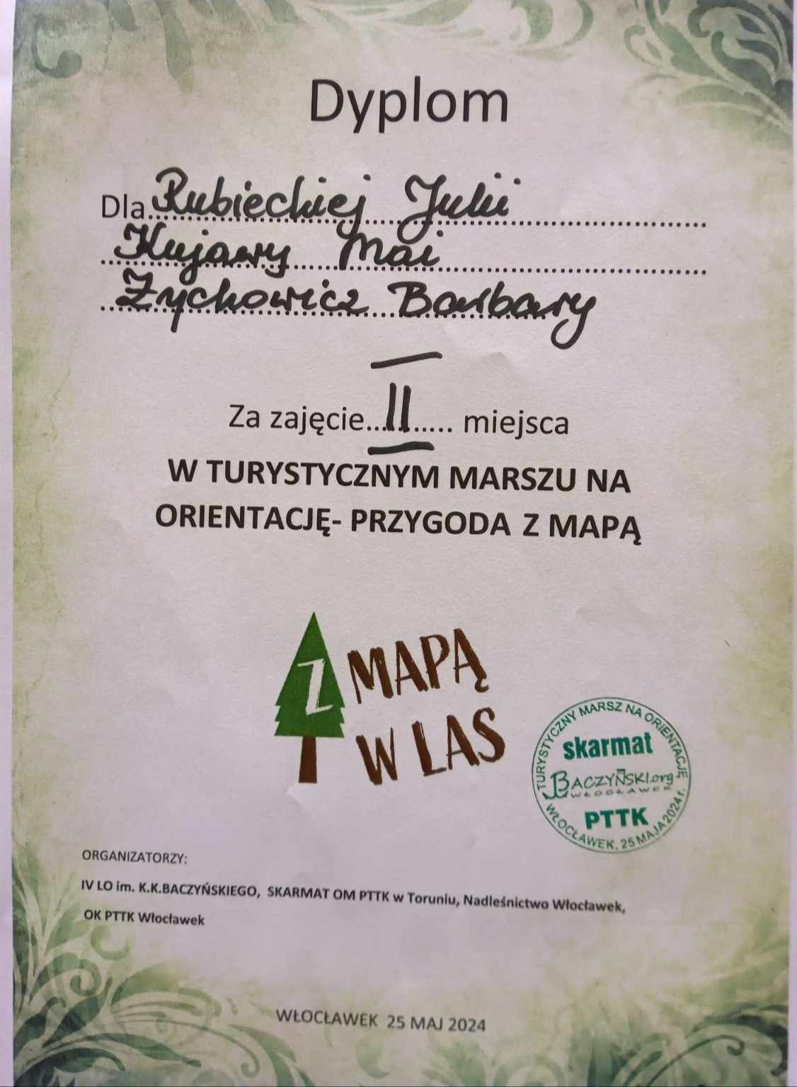 W sobotę 25 maja 2024r. drużyna z naszej szkoły wzięła udział w Marszu na orientację „III Przygoda z mapą”. Zawody organizował Zespól Szkół nr4 im. K.K Baczyńskiego. Polegały na znajdowaniu punktów w terenie. Nasze dziewczyny spisały się doskonale i w stawce 30 drużyn zajęły 2 miejsce. Szkołę reprezentowały: Julia Rubiecka, Barbara Żychowicz i Maja Kujawa, opiekunem był p. Krzysztof Żywica.