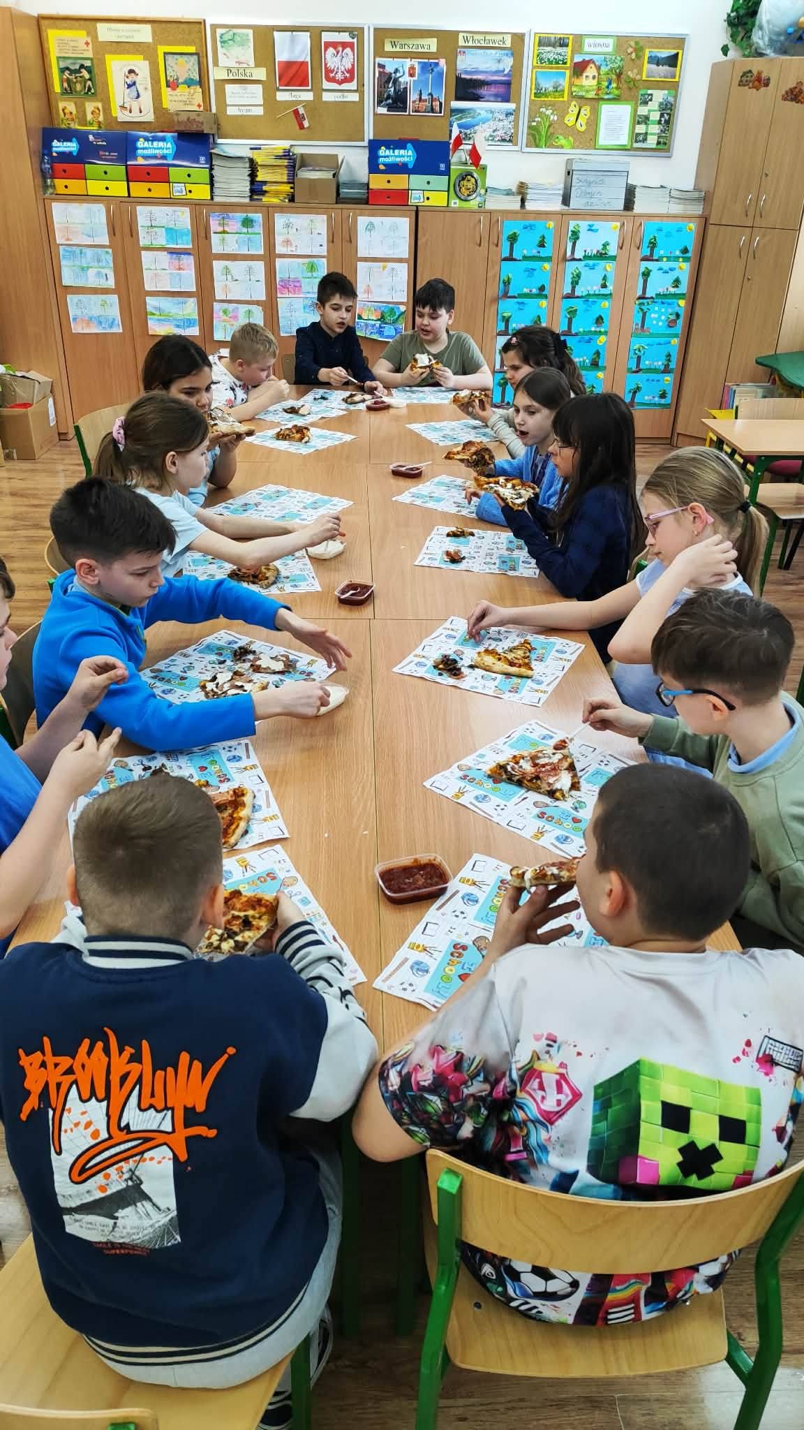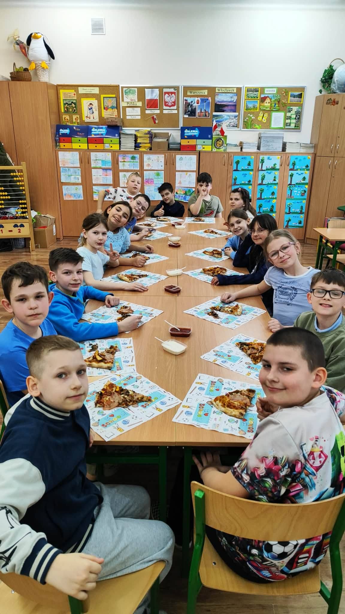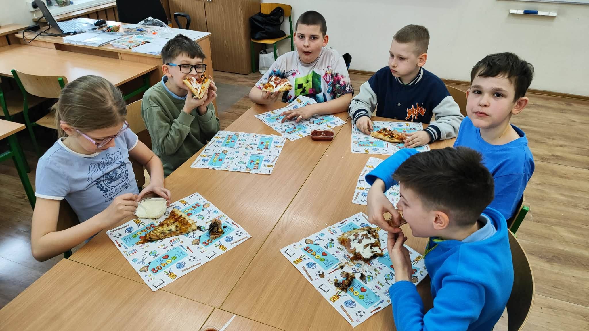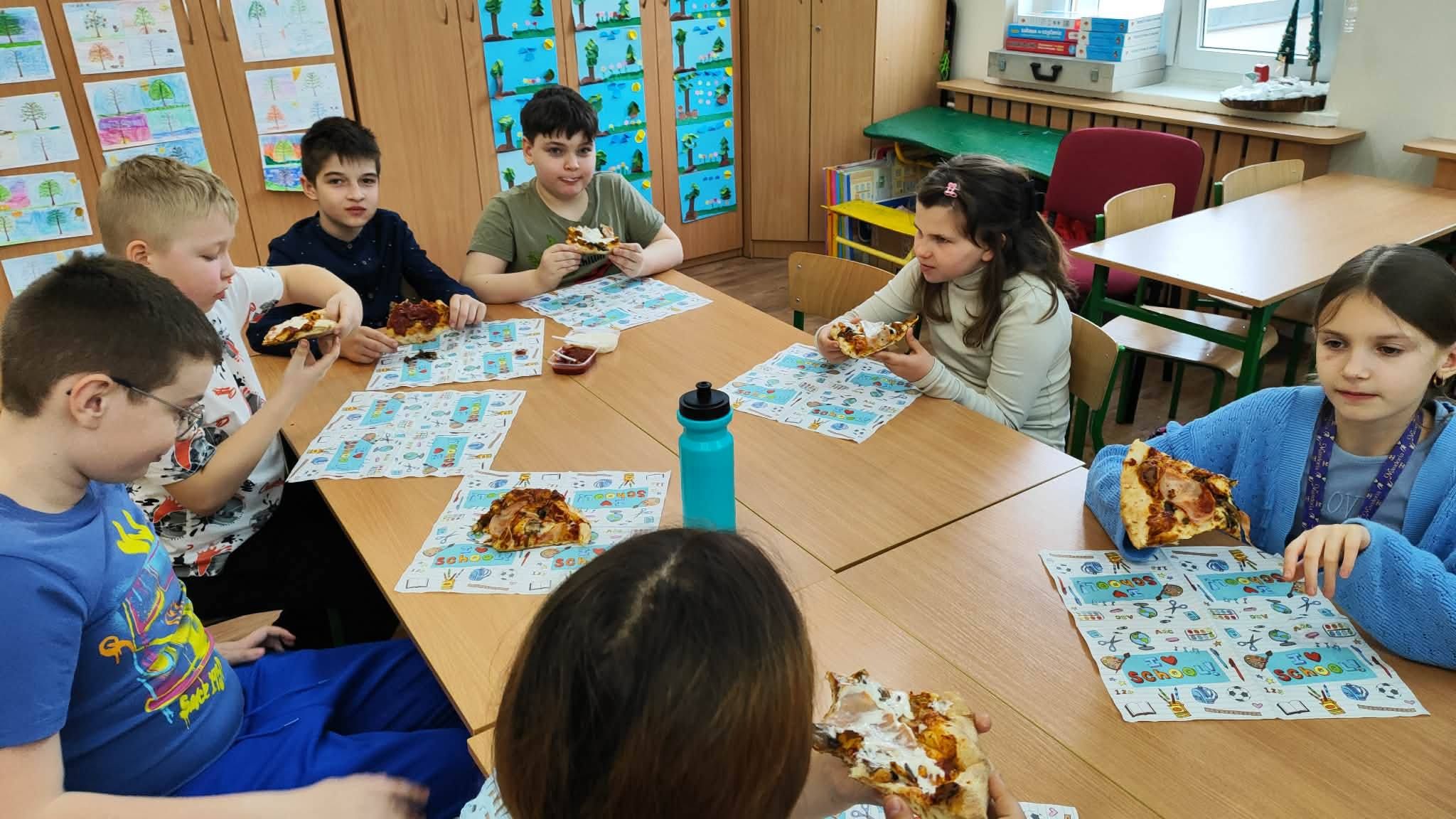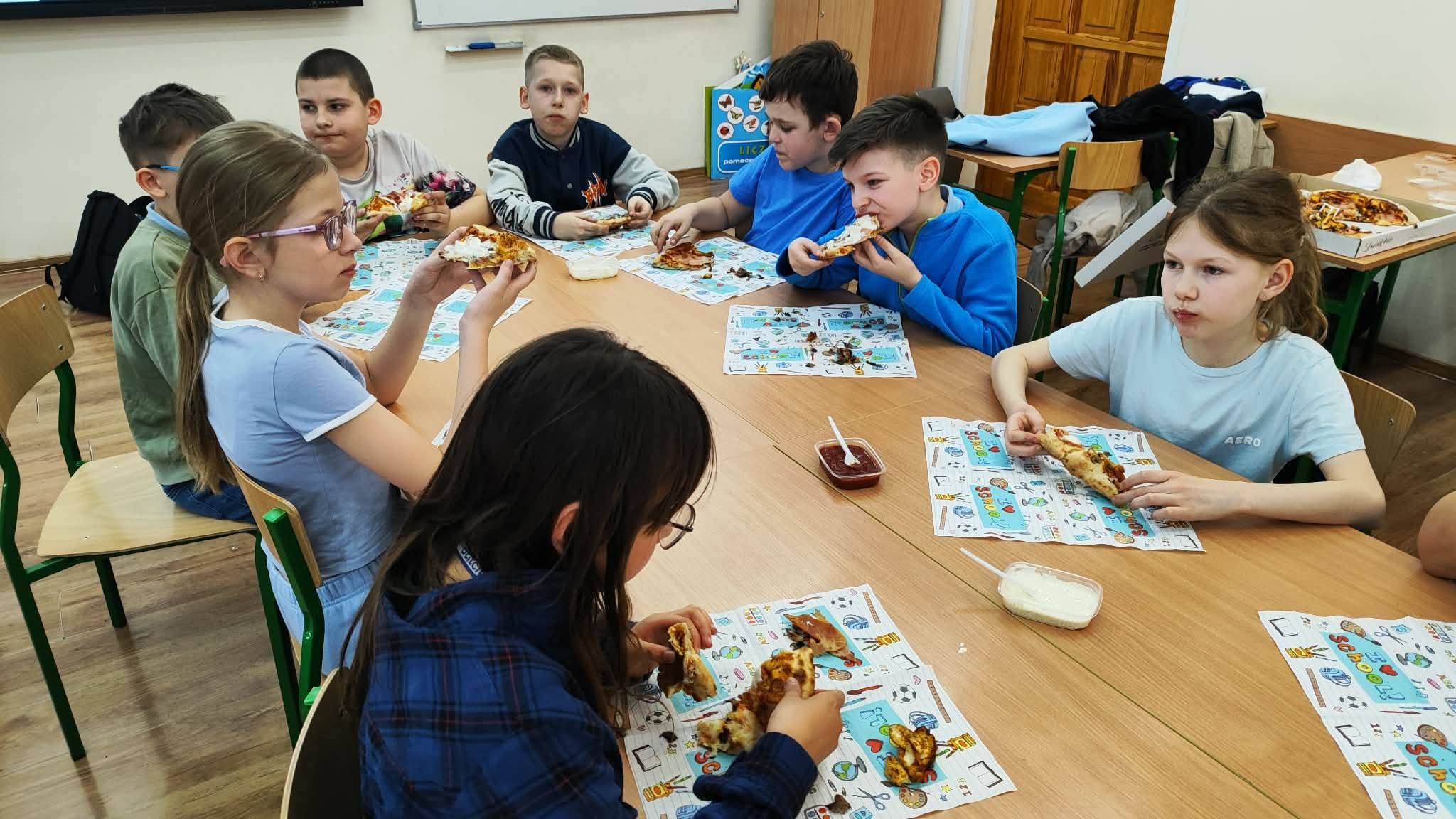 Uczta w kl. III a. Realizacja voucheru na pizzę - nagrody zdobytej podczas szkolnego Dnia Postaci z Bajek