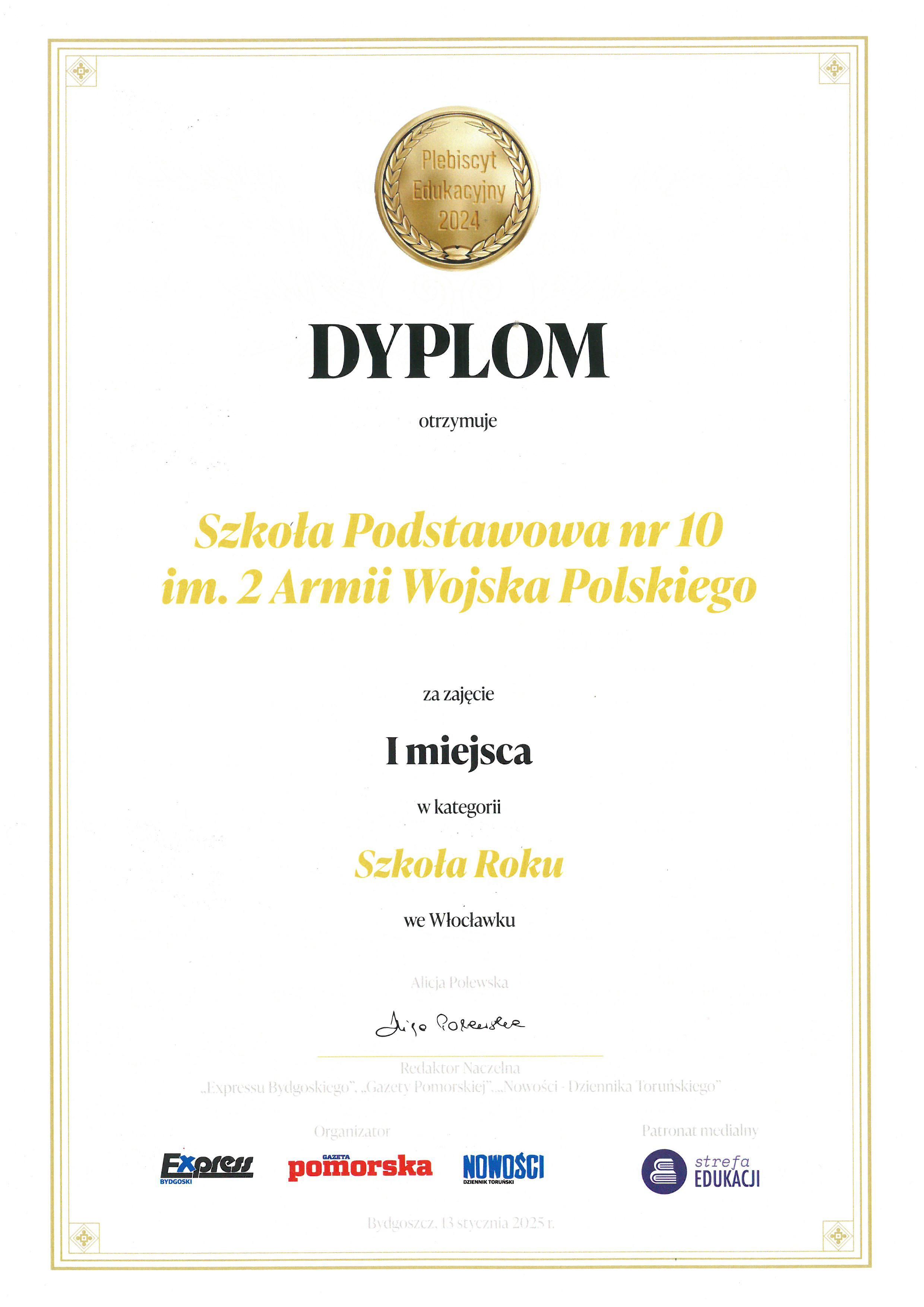 Nasza szkoła zajęła I miejsce w kategorii Szkoła Roku we Włocławku!