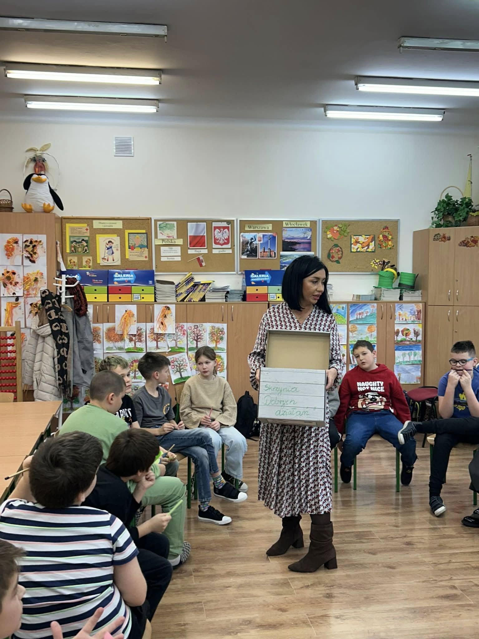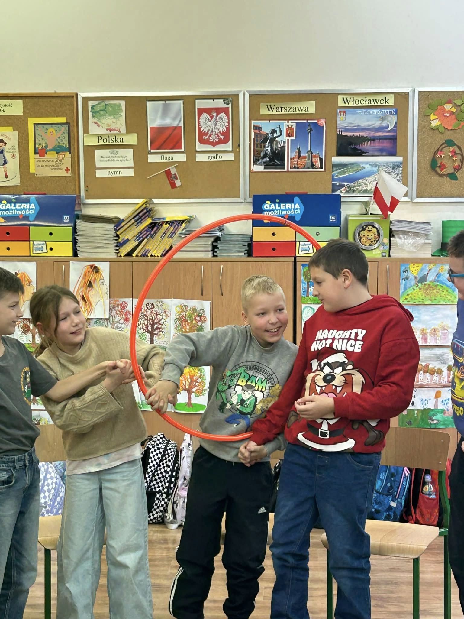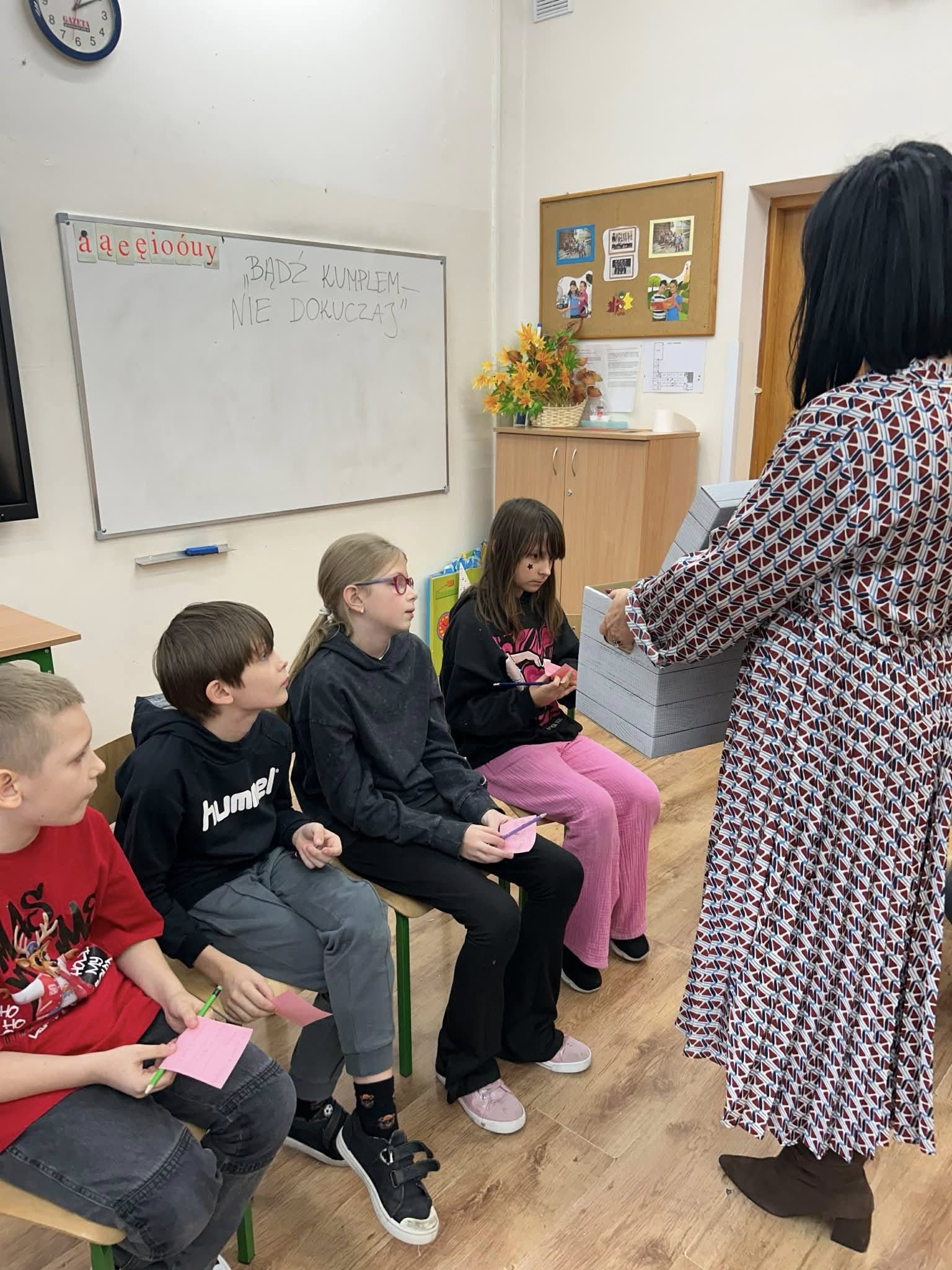 20.11.2025 r. klasa 3 a wzięła udział w zajęciach warsztatowych prowadzonych przez pedagogów szkol. ,p. Eweliną Skucha-Pastucha i p. Joannę Dziedzic. Spotkanie odbyło się w ramach Kampanii społ. ,,Bądź kumplem. Nie dokuczaj”. Oprócz zabaw integrujących zespół klasowy, dzieci rozmawiały o sytuacjach gdy ktoś komuś dokucza, o empatii i radzeniu sobie z trudnymi emocjami. Była zabawa i były bardzo kreatywne wnioski.
