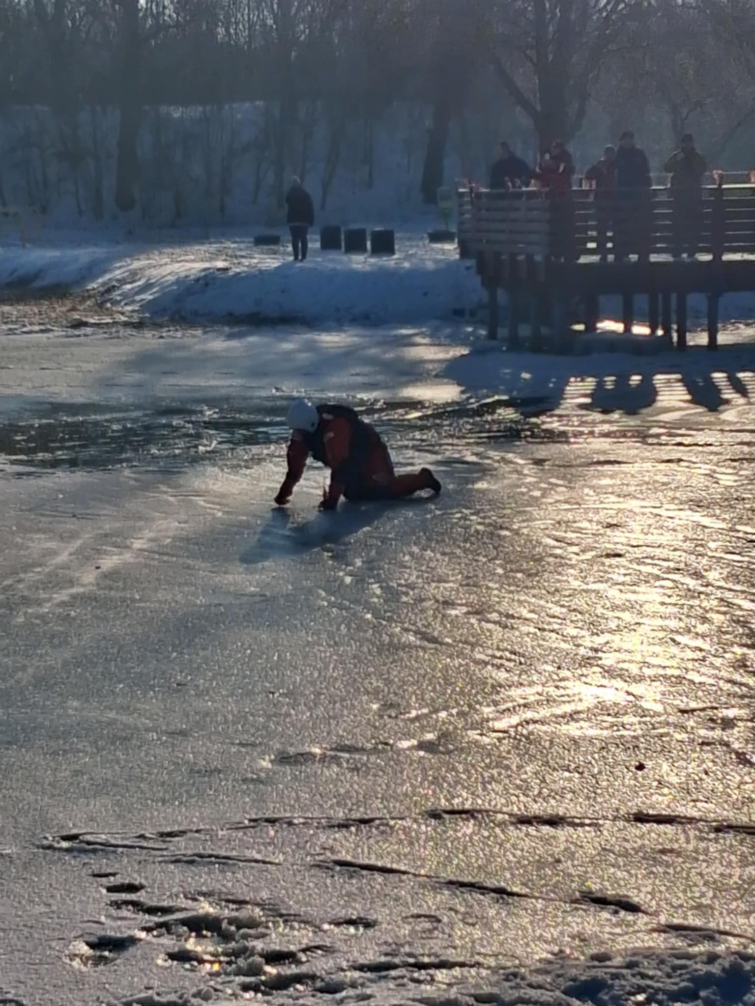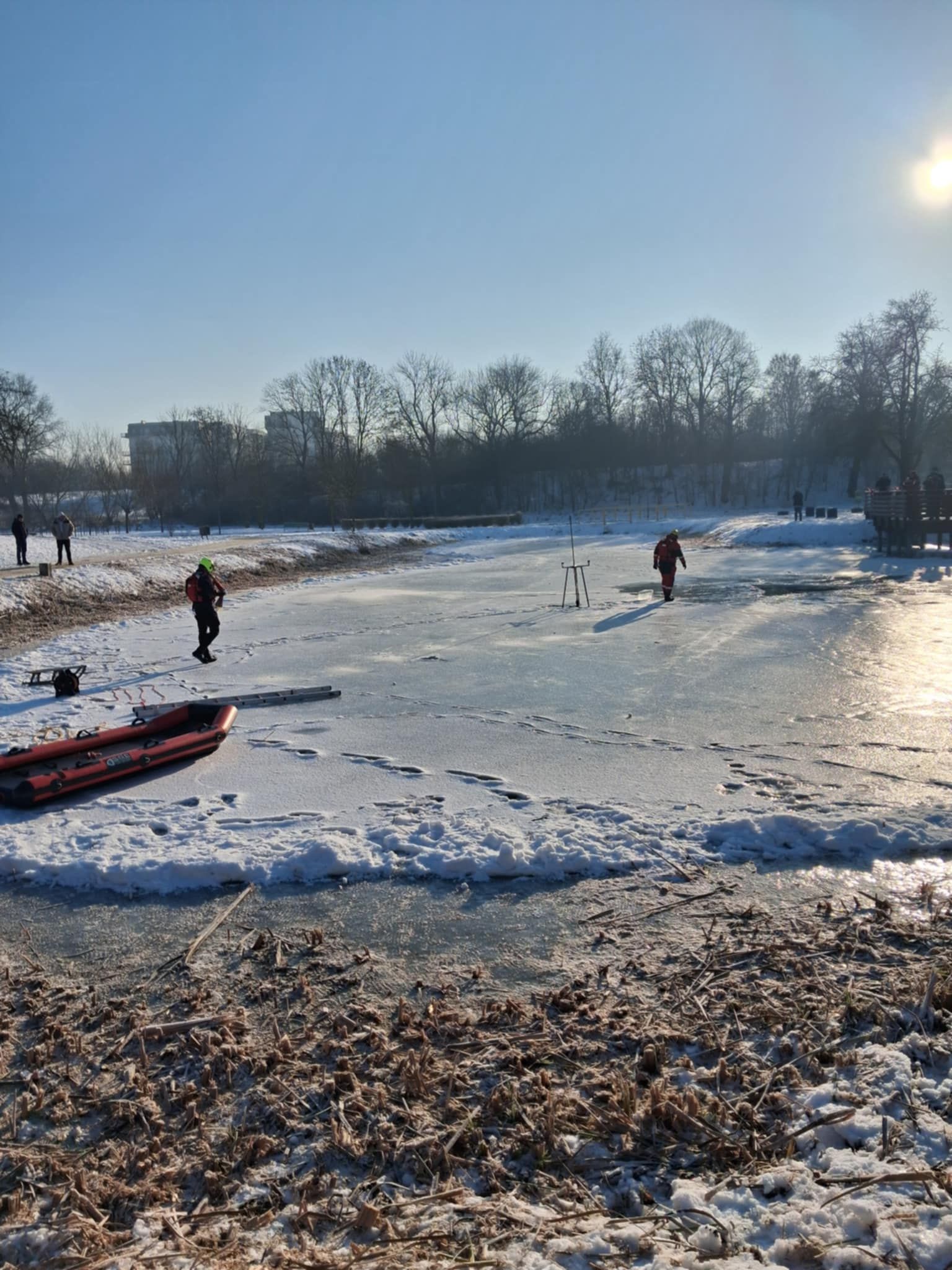 Klasy szóste naszej szkoły 20 stycznia wzięły udział w akcji ,,Bezpieczne ferie 2026" zorganizowanej przez WOPR, Policję i Straż Pożarną. Dzięki srogiej zimie na zamarzniętym zbiorniku wodnym mogły odbyć się pokazy instruktażowe, jak ratować osoby, pod którymi załamał się lód. Uczniowie z ogromnym zainteresowaniem śledzili kolejne sposoby ratowania ofiar niebezpiecznych zachowań na zamarzniętych akwenach.