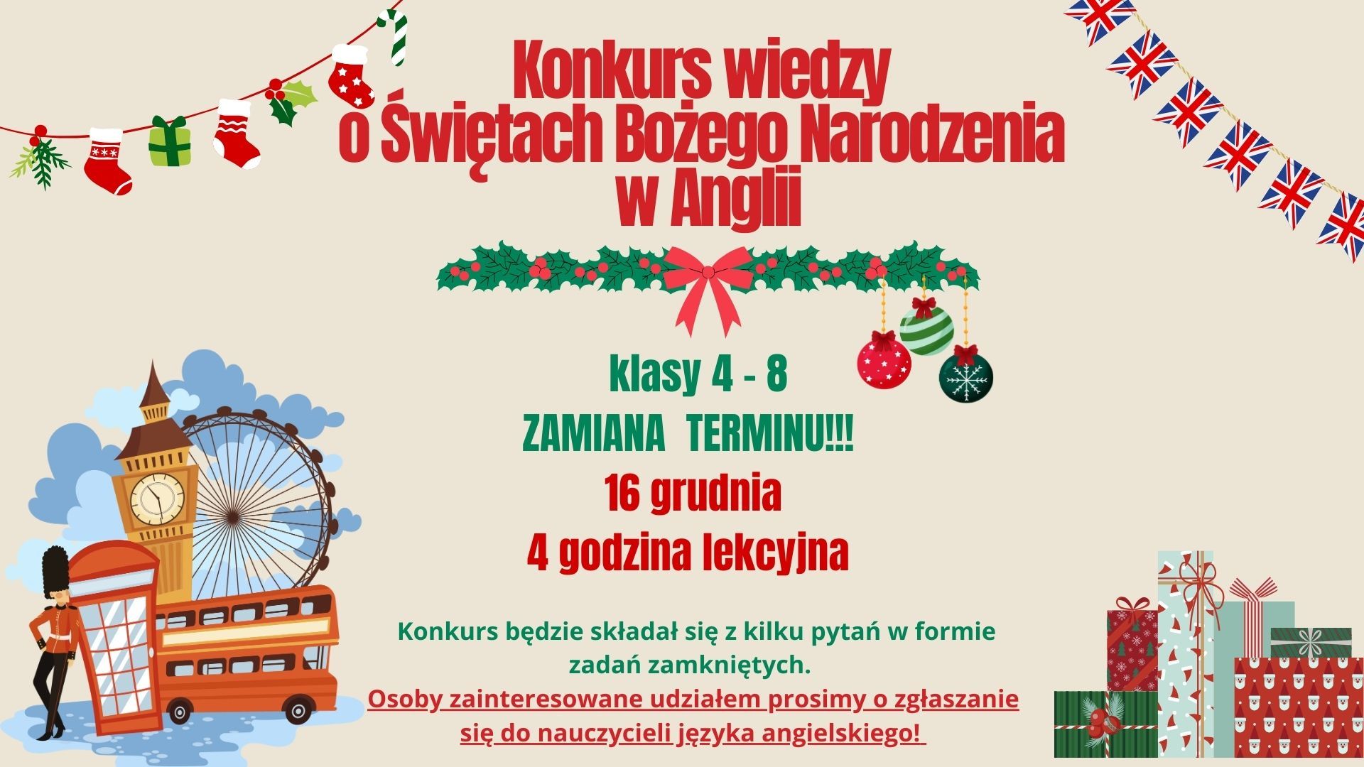 Drodzy Uczniowie! Zapraszamy klasy 4-8 do udziału w Konkursie Wiedzy o Świętach Bożego Narodzenia w Anglii, który odbędzie się 11 grudnia. Konkurs będzie składał się z kilku pytań w formie zadań zamkniętych. Osoby zainteresowane udziałem proszone są o zgłaszanie się do nauczycieli języka angielskiego. Chętnie udostępnimy również materiały do nauki i pomożemy w przygotowaniach. Zachęcamy do udziału i życzymy powodzenia !
