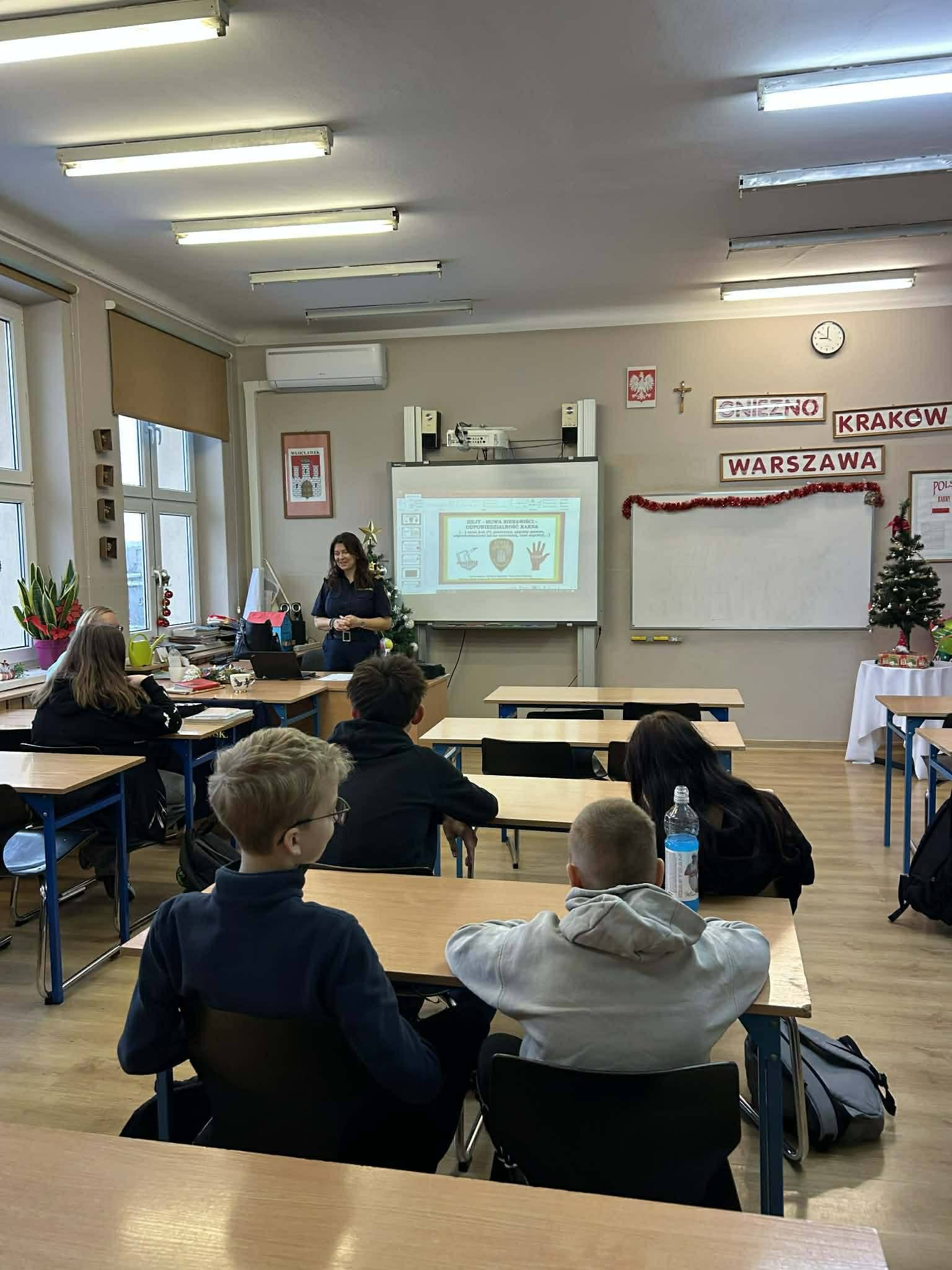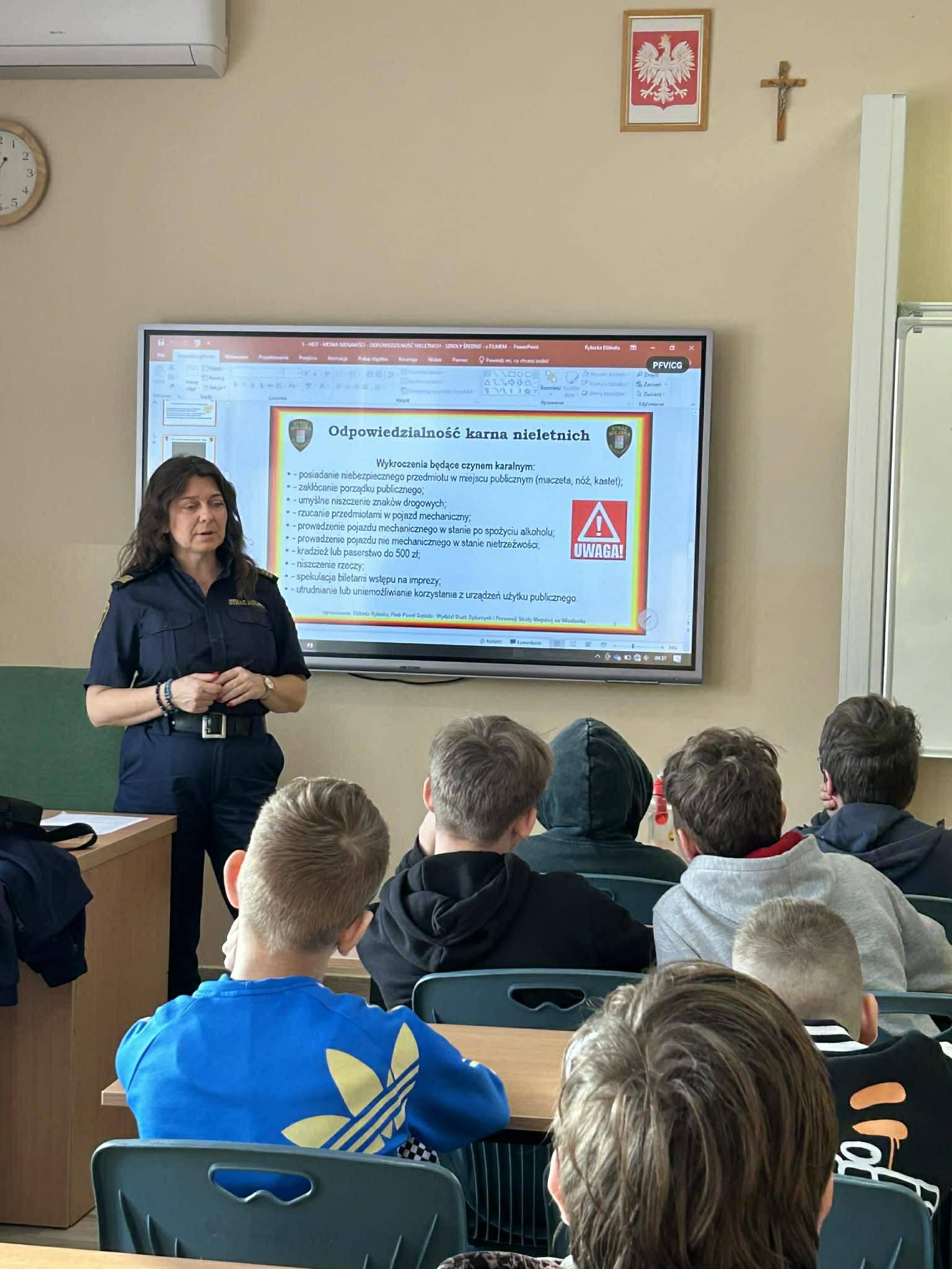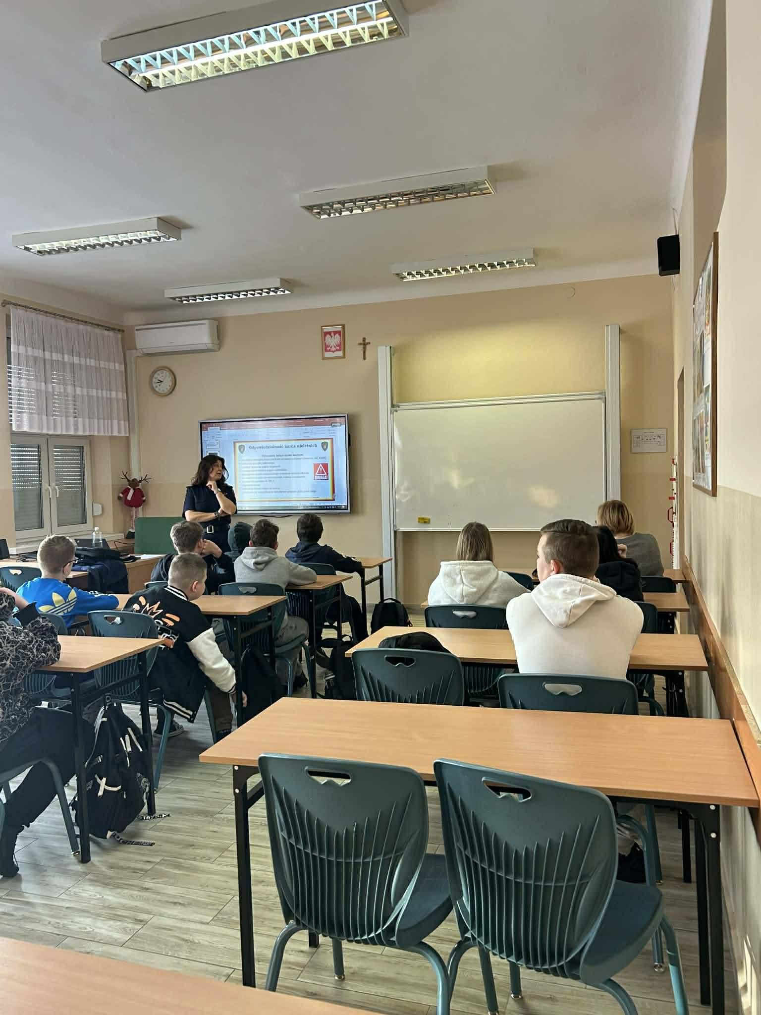 Uczniowie dowiedzieli się o różnych zagrożeniach i konsekwencjach, które mogą zostać wdrożone w sytuacjach łamania prawa.
