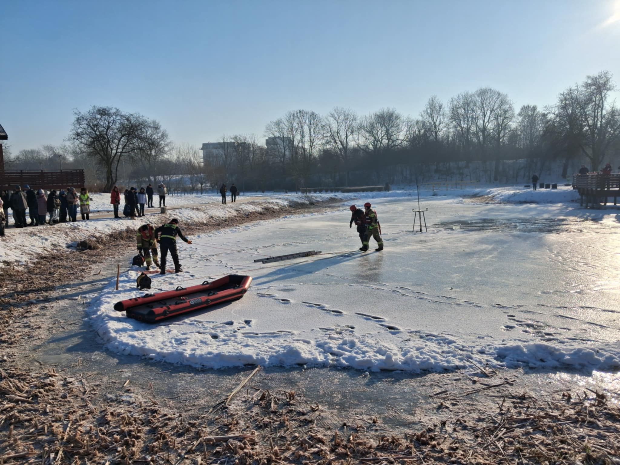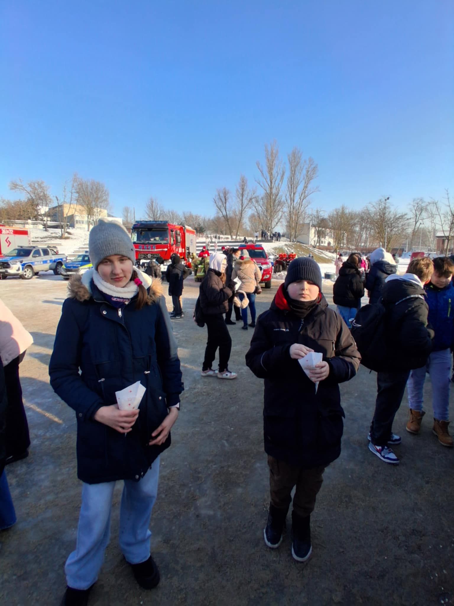 Klasy szóste naszej szkoły 20 stycznia wzięły udział w akcji ,,Bezpieczne ferie 2026" zorganizowanej przez WOPR, Policję i Straż Pożarną. Dzięki srogiej zimie na zamarzniętym zbiorniku wodnym mogły odbyć się pokazy instruktażowe, jak ratować osoby, pod którymi załamał się lód. Uczniowie z ogromnym zainteresowaniem śledzili kolejne sposoby ratowania ofiar niebezpiecznych zachowań na zamarzniętych akwenach.